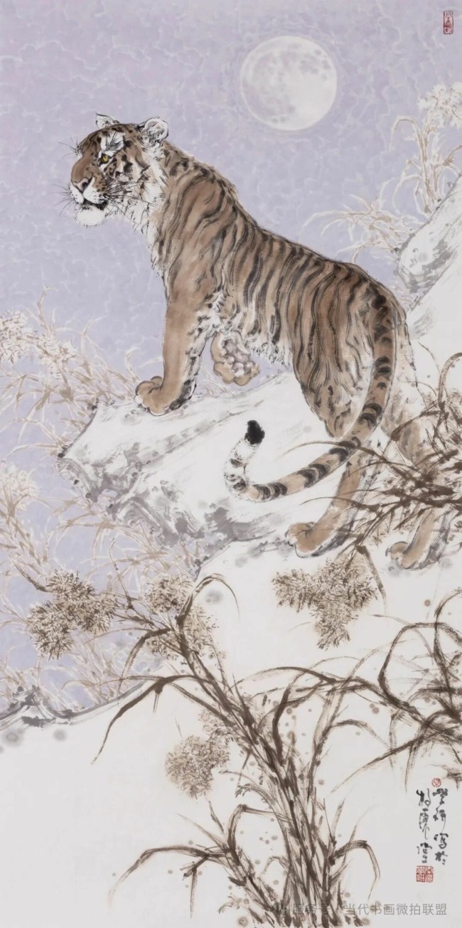 访各大动物园,进行观察写生、搜集素材,废寝忘食,朝斯夕斯,成了真正的当代“虎痴”。耕耘必有收获,近年其头角崭露,不仅屡屡入选大展、获奖,并多次举办个展,深获好评。