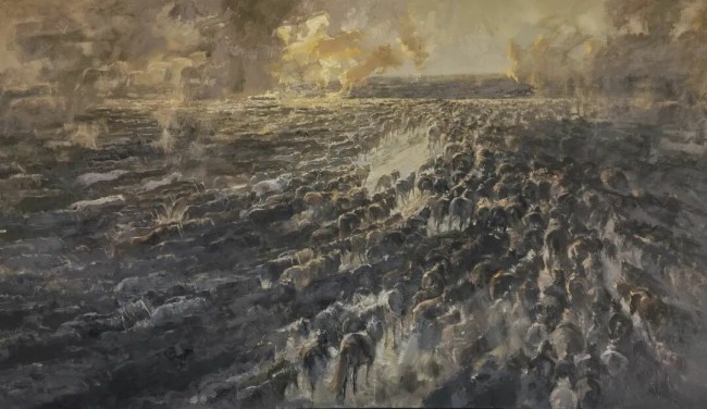 他画战争,不写血腥只绘精神;画群像,不堆数量只塑风骨。《血战古浪》里,冲锋的呐喊藏在墨色鬃毛间,铠甲以焦墨点染,是绝境中未灭的希望;《西行》中,万马奔腾在大漠留下浅灰剪影,天际线与沙海融成朦胧一片,却让人读懂“西出阳关无故人”的苍凉悲壮。郑春龙深谙“计白当黑”古训,他笔下的灰白从非空无,是云隙天光,是战士眼中的坚定,是历史留白处的回响。恰如古人画山水“咫尺有万里之势”,他的画中,数笔云涛便装得下千军万马的气势,容得下岁月长河的深沉。