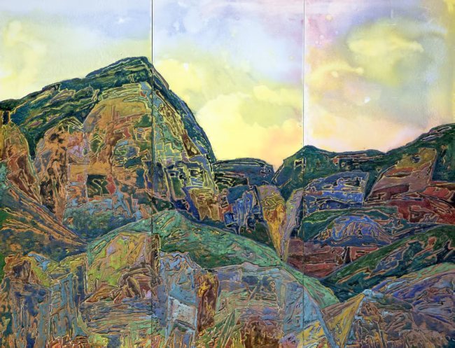 孙肖嘉对色彩的驾驭,浸透着女性特有的敏感与细腻,如同一双温柔的手,在画布上抚摸出情绪的温度。她的色彩绝非孤立的视觉符号,而是与造型、空间、肌理达成了精妙的有机统一:或如晨曦轻吻荒原,暖色调在肌理的起伏中漾开生命的暖意;或如暮霭笼罩山峦,冷色调在层叠的材质里沉淀出静谧的哲思;又或如激流奔涌峡谷,强对比的色彩在碰撞中迸发野性的力量……