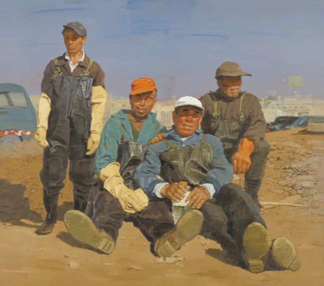其作品最动人心魄的,是对平凡生命的平等凝视与尊严赋形。他的画笔既聚焦城市化进程里汗湿工装的建设者,也停驻边地高原上被风沙雕琢的面庞:风霜刻入的皱纹被视作生命的年轮,尘土覆盖的手掌被赋予劳作的荣光,就连休憩时遥望远方的沉默,都被定格为一种庄重的生命仪式。正是这份不带滤镜的真诚,让每一个平凡身影都在画布上获得了超越时间的重量。