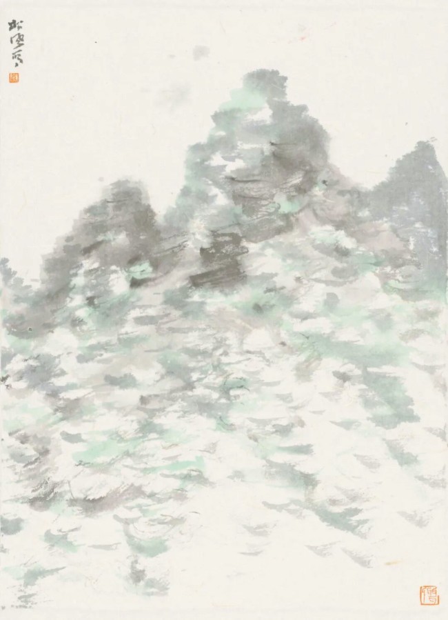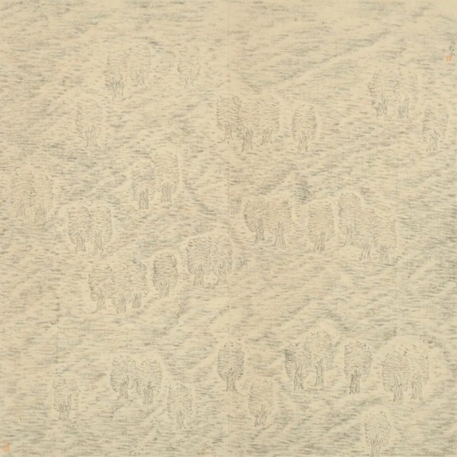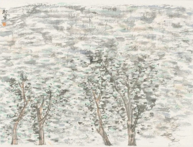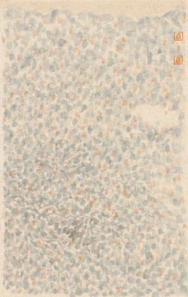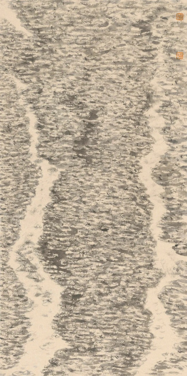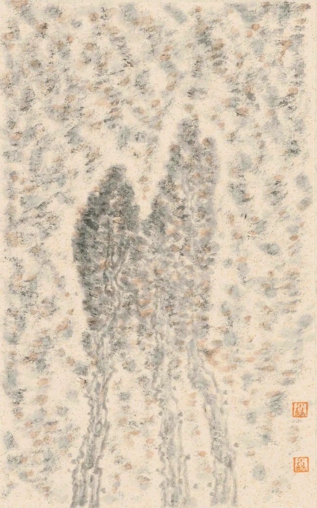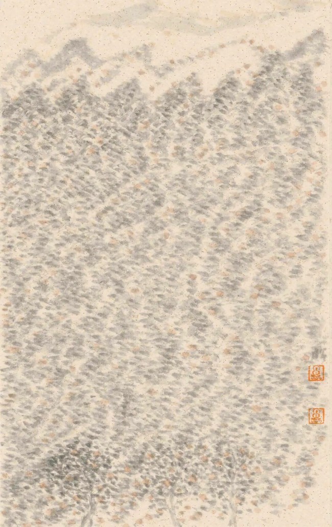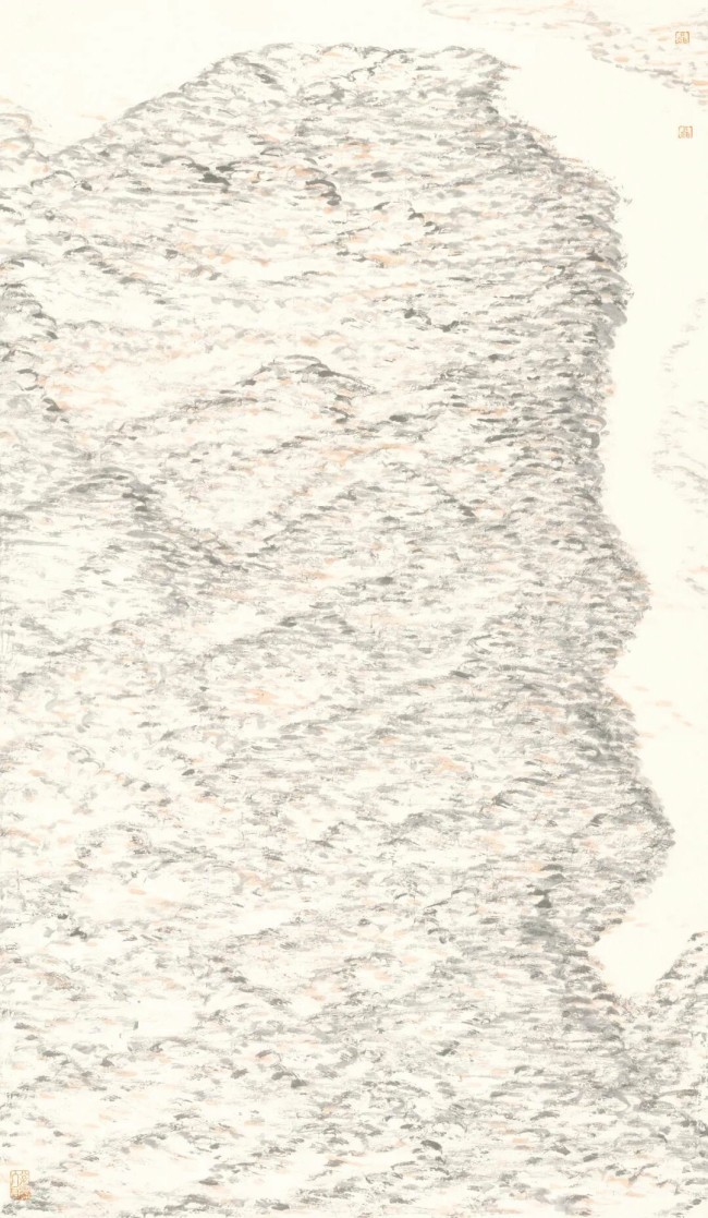 聂松的山水画中,没有高山流水,没有闲云野鹤,没有山林高士……只见点点墨迹胀满画面,散乱中潜藏着秩序,重复中孕育着不同。这些画所描摹的似乎处于某种边缘,让人难以把捉。然在某个不经意的“蓦然回首”间,又敏锐地显现。