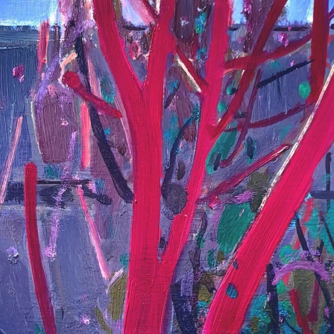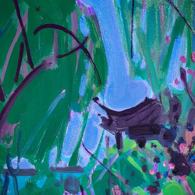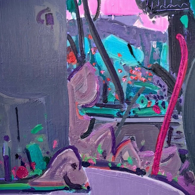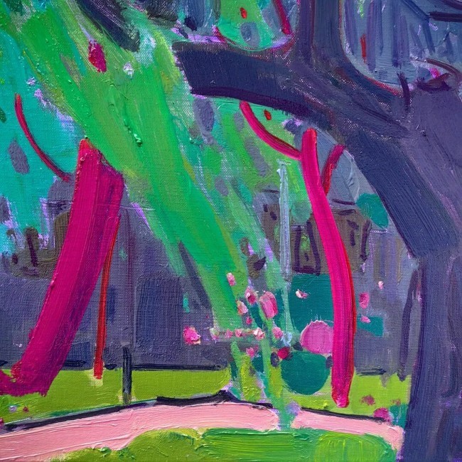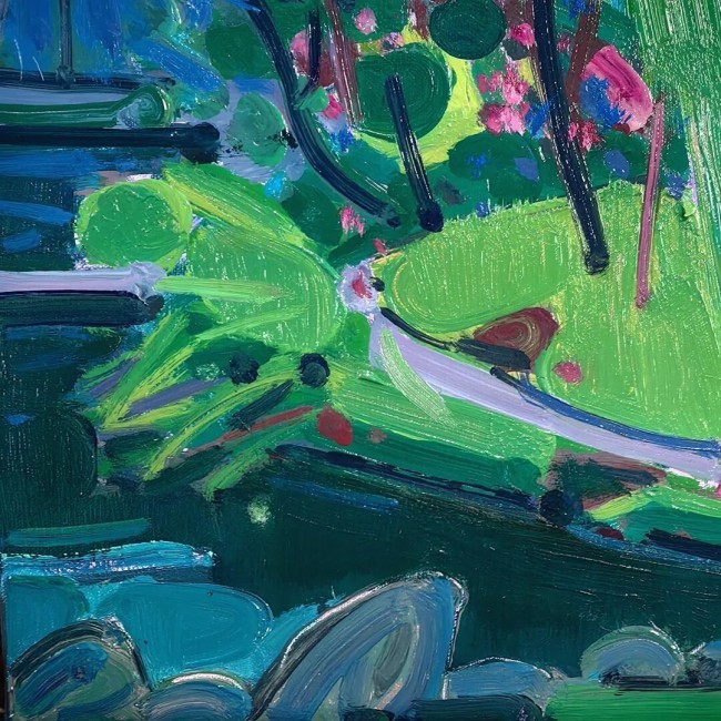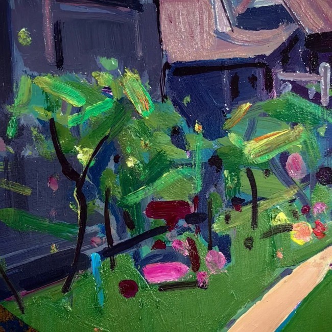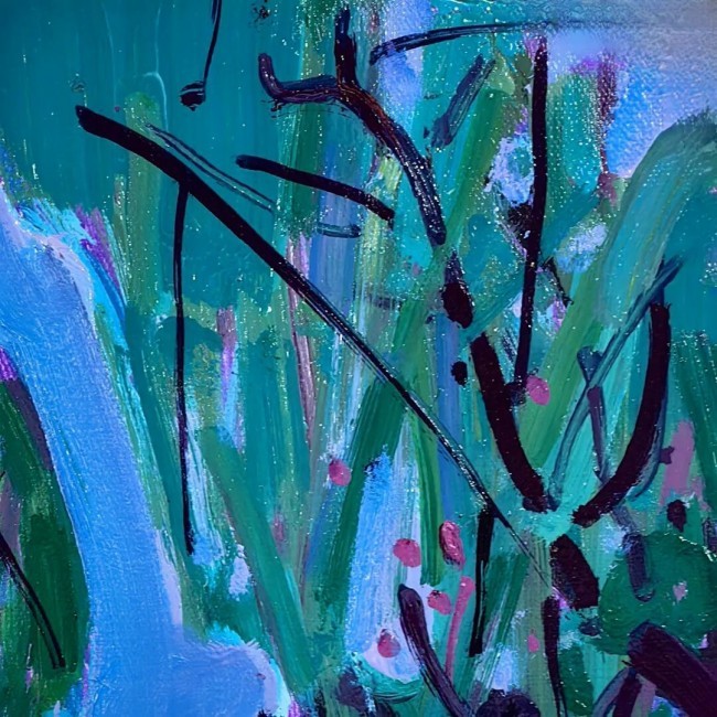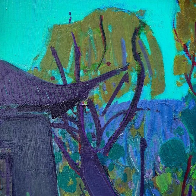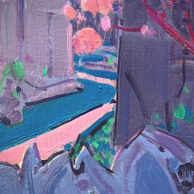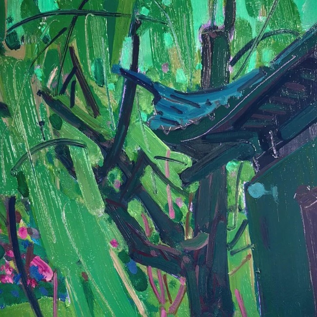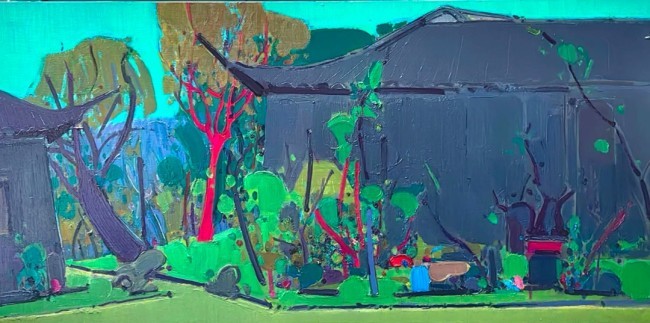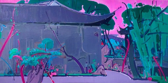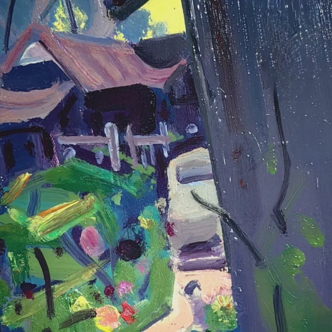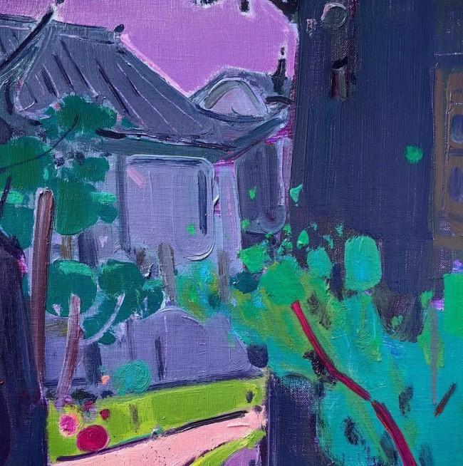 题材选择上,宋永进的油画风景始终聚焦于“乡土中国”,尤其是浙西兰溪一带的古村落、田埂、老巷。这些并非猎奇式的“乡土符号”,而是他对“家园记忆”的深情回望。在《老巷深处》中,他没有刻意渲染古巷的“古朴”,而是捕捉日常场景:墙角的杂草、斑驳的木门、晾晒的衣物,以细腻却不琐碎的笔触,将平凡风景转化为充满人文温度的画面。这种创作视角,让他的风景超越了“风景”本身,成为对乡土文化、人与自然关系的思考——在快速城镇化的背景下,他的画笔如同“文化存档”,以“意笔”的柔软与厚重,留住了即将消逝的乡土诗意。
