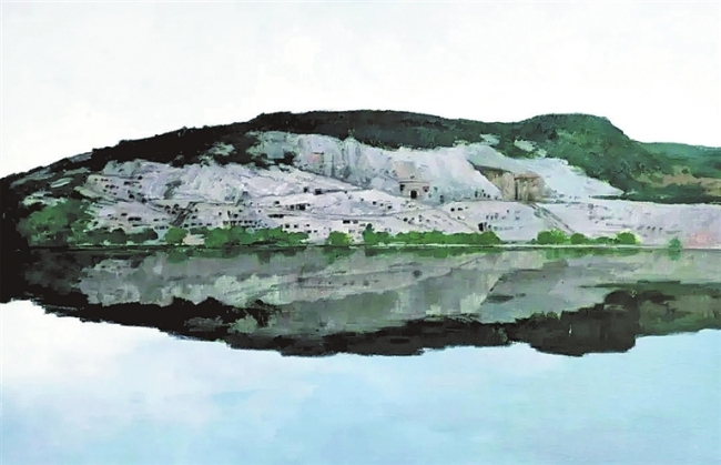 在当下美术界的印象中,刘杰首先是科班出身的油画家,然后才是独嗜花鸟的国画家。但依我陋见,他应当同时是油画家和国画家,不分轩轾。近些年,其油画作品往往有“意笔”熔渗的迹象。譬若,描绘洛阳古石窟群及其临水倒影的《龙门印象》(130cmx200cm),画面上、下方大幅留白,借助丰富而又含蓄的色彩渐变,将某种岑寂而又辽远的哲学“空”境,表达到攫人心魄的程度;另有《林州石板岩写生》(70cmx100cm),“平远”与“高远”相结合,远山部分散锋淡彩、纵横皴擦,极杳渺之致;再如《信阳潭家庙写生》(70cmx100cm),画中高挑秀挺的树木所流溢而出的驰毫“勾写”趣味,令我瞬间联想到了霍贝玛的《米德哈斯尼斯的小道》。