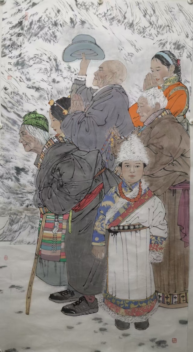 吴欣民对少数民族题材的选择,是一场对文化多样性的深情礼赞。在他的视野里,每个少数民族都是一部鲜活的文化典籍:或是雪山下藏族同胞的虔诚笃定,或是塬上人家的质朴爽朗,他深入各民族的生活肌理,捕捉他们在不同自然环境与文化传统中淬炼出的精神特质—那份共通的坚韧,在高原风雪与黄土沟壑的磨砺中愈发鲜明;那份迥异的风情,在服饰纹样、生活习俗的细节里各成风景。他以艺术家的敏锐,将各民族的生存智慧、信仰底色转化为人物的眼神、姿态与服饰褶皱,使每个民族的形象都摆脱了“他者”的疏离感,成为可感可触的文化生命体。