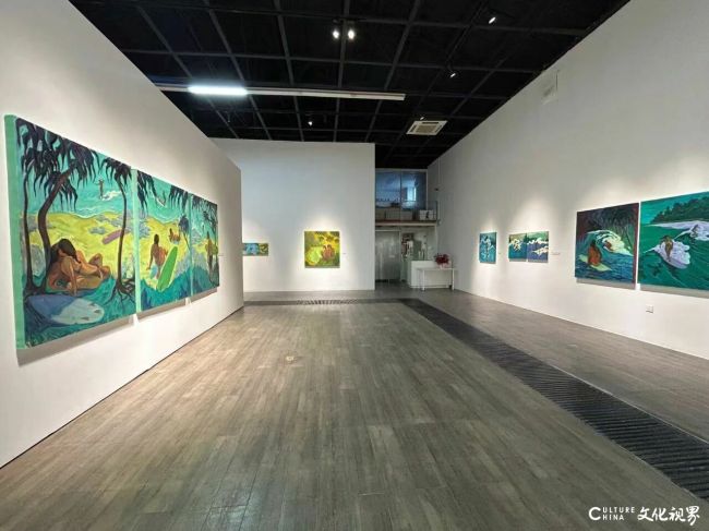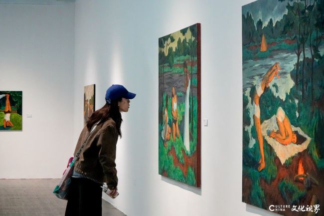 何红舟教授熟知蔡猜的创作历程,他表示:蔡猜近些年的作品令人耳目一新。她以表现性色彩融合多样场景,构建出极具张力的画面,既呈现海边生活,又传达出神秘浓郁的原始意味。其风格不同于写实或流行绘画,而是借朴拙造型与夸张色彩表达个人感受。这种绘画方式,或许正是蔡猜所追求的“最纯粹的感应能力”,她将自己抛向“远方”的浪涛中,希望通过画笔呈现内心的真实感受。本次展览的学术主持夏可君教授在开幕式现场说:“小蔡老师的作品功底扎实且主题诗意。在疫情后略显低沉的时代,真的需要有一种非常的热烈抒情,有生命昂扬、有青春活力的作品。她将植物、海浪与人物巧妙融合,色彩关系处理得非常漂亮,展现出女性所特有的一种对色彩的敏感天赋。
