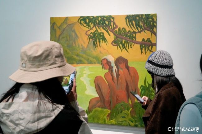 天津美术学院教授、油画系主任袁文彬在现场采访中指出:“蔡猜的作品充满狂野的浪漫与生命力。她的“逐浪”之旅让人不禁联想到高更毅然离开巴黎,奔赴塔希提寻找他的艺术伊甸园。对于蔡猜而言,海洋便是他的“塔希提”,一个脱离现实、安放精神的“彼岸”。充满原始活力的植物、蕴含无穷动感的海浪,以及姿态舒展、近乎赤裸的人体。这一切共同指向了“勃发的生命力”这一核心主题。她的艺术并非现实主义的描摹,而是具有强烈的“象征性”。在当下快节奏的都市生活中,每个人或许都在寻找自己的“精神故乡”。蔡猜的作品以其诗意与浪漫情怀,精准地触及了这份共同的向往。”