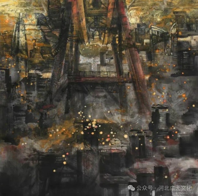 这种材料革新之上,是邹明对艺术符号的重构。他摒弃了传统水墨中山川、草木的经典意象,转而将钢筋、厂房、塔吊这些都市特有的符号纳入画面。这些原本属于工业场景的冰冷元素,在水墨的渲染下被赋予了新的生命力:纵横交错的钢筋不再是建筑的骨架,而成为都市生长的脉络,勾勒出城市化进程的急促与力量;塔吊的剪影在水墨的晕染中褪去机械的冰冷,化作都市发展的见证者,静静诉说着建设与变迁的故事……这些符号的转换,让水墨艺术彻底走出了传统山水的桎梏,转而聚焦现代都市的真实面貌——它不再是理想化的自然图景,而是充满生机与矛盾、繁荣与困境的当代生活现场,这种贴近现实的表达,让观者能在熟悉的符号中找到情感共鸣,进而引发关于自身与都市关系的思考。