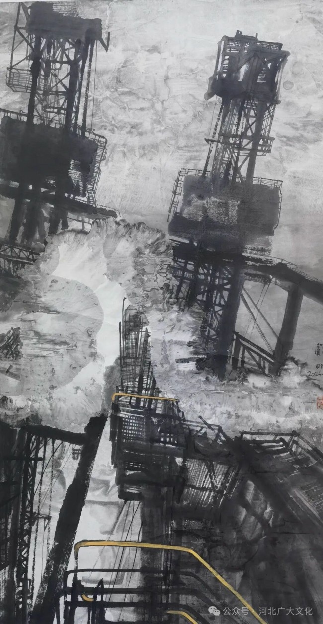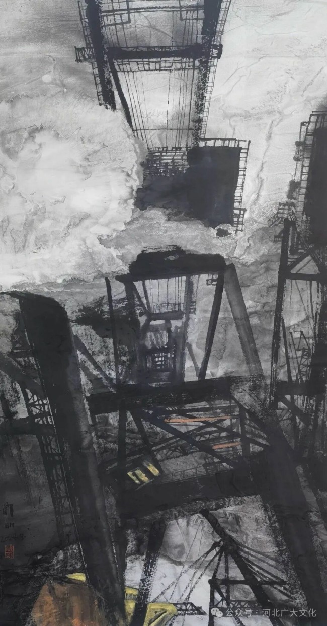 在视觉革新的背后,邹明的都市水墨始终蕴含着对时代精神的深刻洞察。他笔下的都市,从来不是单一的赞美或批判,而是一种矛盾的审视:画面中高楼林立的繁荣景象,清晰展现着工业文明带来的进步与便利,同时也揭示着城市化进程中环境破坏、资源消耗的隐忧。这种辩证的视角,让作品超越了单纯的风景描绘,成为对当代社会发展的理性思考——它不回避问题,也不否定进步,而是以客观的姿态呈现都市发展的全貌,引导观者跳出对“现代化”的片面认知,进而思考人类文明的未来发展方向。