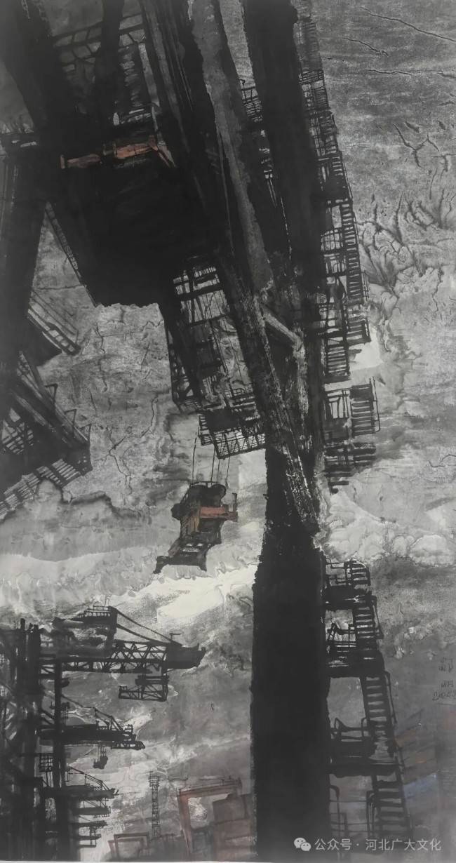 值得注意的是,邹明在这种矛盾审视中,始终注入着对生命的积极隐喻。他笔下的都市,常带着“废墟”般的沧桑感——斑驳的墙面、锈蚀的金属,仿佛是文明发展中留下的伤痕;但在这些“废墟”的细节里,又总能看到新生的希望:水墨的温润晕染让冰冷的工业符号有了温度,铁锈与泥土的交织中藏着生命的韧性,仿佛只要有一丝契机,便能从废墟中生长出新的生机。这种“废墟与新生”的交织,构成了作品中“涅槃”的核心隐喻——在城市化的尘埃中,仍然潜藏着新生的可能。