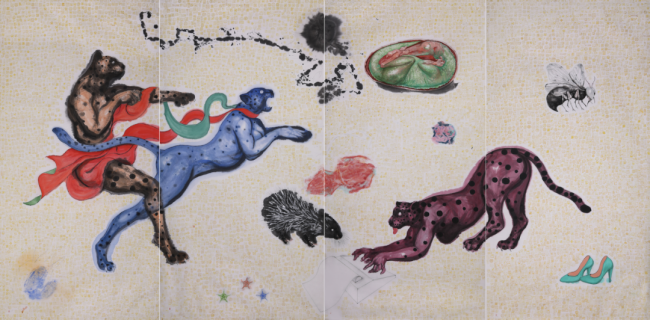 冀少峰:“石磊老师最大的特点就是多思善思、多变善变,他没有固守一种风格,他永远在不确定中,所以总能给你带来视觉的惊喜与期待。他的每次展览都带给你不一样的内容。他曾经有一幅油画,就是一个花豹,踩着陶瓷的瓶子,我觉得这个作品它很有寓意,陶瓷是China的感觉,陶瓷是易碎的感觉。那么当艺术家转向水墨的时候,水墨、陶瓷、书法、大漆最是代表中国经验,也最有中国文化符号礼仪。用它转向水墨的时候,就表现了中国的经验、中国的气派、中国的风格、中国人的主体性,他在用水墨来讲中国的故事,强调中国文化本土的一种自信,在一个全球化的这种文化语境当中,水墨其实就是我们今天要讲的中国价值、中国经验、中国气派、中国风格。”