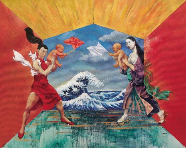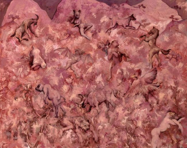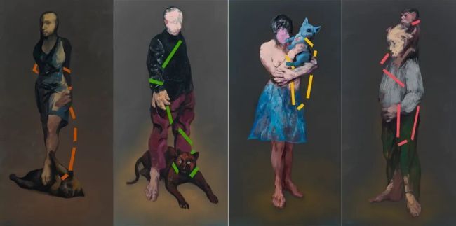 《族群进化》中,猛兽的困顿与器皿的静默,共同编织着关于当代生存境遇的寓言。那些扭曲的形体与冲突的色彩,既是欲望的视觉外化,更是现代人精神焦虑与内在孤独的深刻写照。《有你》系列呈现人与动物的博弈,以严谨的理性逻辑构建画面结构,却在笔触间流露出顽皮的戏谑,冲突、压抑、怜悯、矛盾等多种情绪反复刺激着观者的感官。《生息之地》在十二生肖