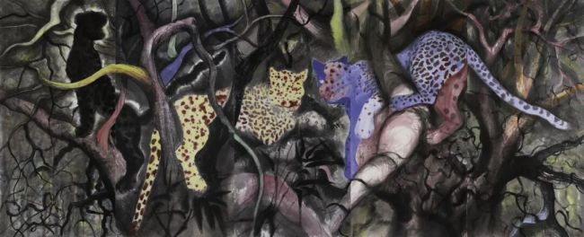 邓箭今:“从八五之后,一直过来,石磊的创作线路都是特别清晰的,他在当代艺术里边,尤其在架上作品这一块,除了油画,还有国画、水彩等等方面都进行了一些新的尝试和探讨。他作品中动物的人性化,包括对于动物跟人之间的关系的塑造,体现了对社会的一种暗讽,十分有趣,尤其是在中国当代艺术里面,这种图形的表达应该是比较少有的。”