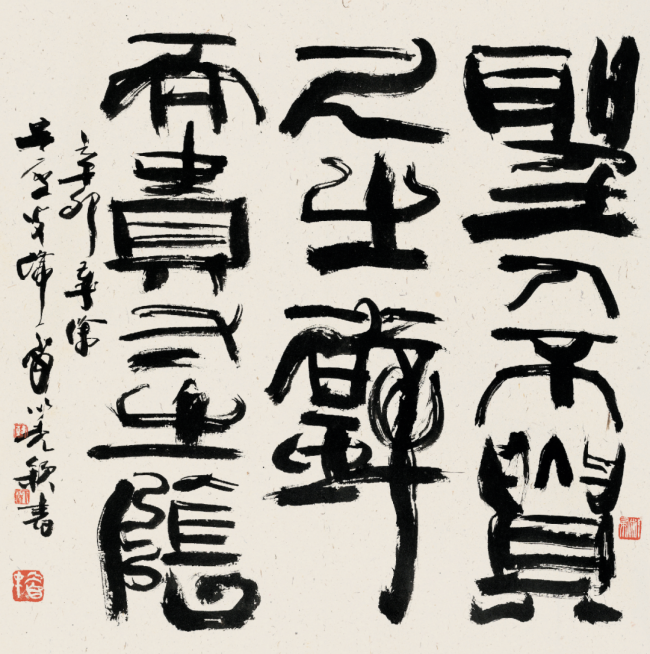 对当代书坛最大的艺术贡献,无疑是韩氏草篆的创建。韩氏草篆源于篆额和碑刻,参以竹简、缪篆、八分等多种元素,巧妙地运用草书笔法将原是静态的篆书笔画进行动态化的运作,将工稳的篆书结构进行变形化的造型,使之产生线条的动感浪漫之美和结构的灵动变幻之美,具有—种龙跃天门的豪迈气势和虎卧凤阙的雄悍风采。