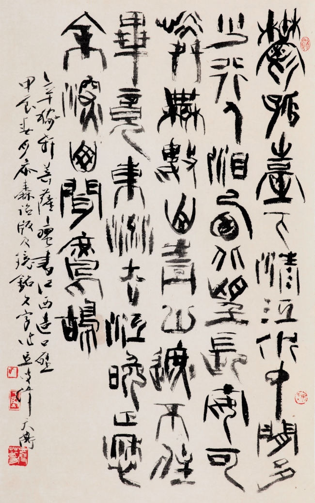 释文:郁孤台下清江水,中间多少行人泪。西北望长安,可怜无数山。青山遮不住,毕竟东流去。江晚正愁余,深山闻鹧鸪。辛稼轩《菩萨蛮·书江西造口壁》。甲辰春月,参秦诏版及镜铭文字作,豆叟韩天衡。