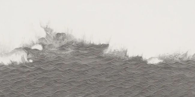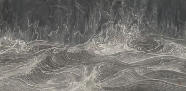 我用了近两年的时间去熟悉和掌握这种“牧羽式”的水法。中国画讲究“法式”,我的水法是我自己定义的新法式。这种法式改变了我与图像、与材料、与所指的关系。2016年底在中国美术馆的“工在当代·第十届中国工笔画大展”,是我水图系列作品从纯粹的语言探索,转向文本重构的重要契机。我把古代山水画经典图像中的水纹及形态用我的语言复现,而其他的山石树木屋宇舟人,都用空白代替,我想用这种类似于照相底片一样的图像反转,用完全的视觉陌生化去构建一种全新的意义。五联组画《水岸图》、《江山》、《南宋》等一批作品,都是这一思考的代表之作。