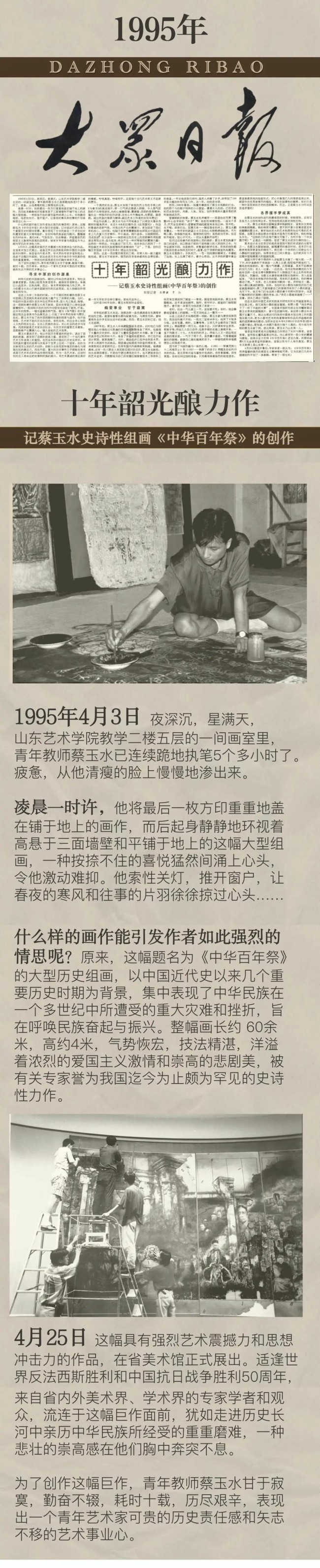 30年前,即中国人民抗日战争暨世界反法西斯战争胜利50周年的1995年,在山东,在山东艺术学院,诞生了一组反映此一重大题材的大型水墨历史人物组画《中华百年祭》,作者是该校青年教师蔡玉水。整幅画作,长约60余米,高约4米,架构恢宏、技法精湛,大气磅礴、沉郁凝重,洋溢着浓烈的爱国主义激情和崇高的悲剧美,被有关专家学者誉为我国当代当时为止颇为罕见的史诗性精品力作。蔡玉水的出现和《中华百年祭》的诞生,实属难能可贵,它为沉寂已久的中国画创作,开创了一条新路,带来了一股生机,具有里程碑式的现实意义!