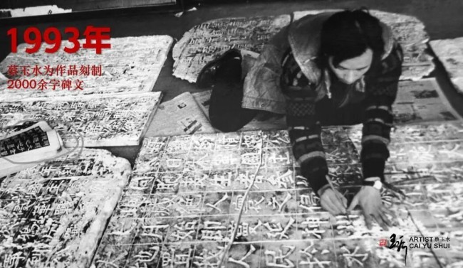 经历过这场意外的变故和心灵的曲折,蔡玉水更加执着于自己的追求,他以数倍于前的干劲和毅力投入到创作之中。与专业画家不同,他是教师,有繁重的教学任务,所有的创作都只能放在教余和休息时间干。盛夏,位于顶楼的画室热如蒸笼,蔡玉水光着膀子,手执刻刀,一笔一划地镌刻着碑文,手磨起了血泡,头上生满了痱子。妻子心疼他,从不多的积蓄中拿出钱买来空调送到了画室……寒夜,画室里地板冰凉,蔡玉水双膝跪地,近乎虔诚地画呀、描呀,夜半时分,画室的门被轻轻推开,妻子披一身雪花为他送来了夜宵……