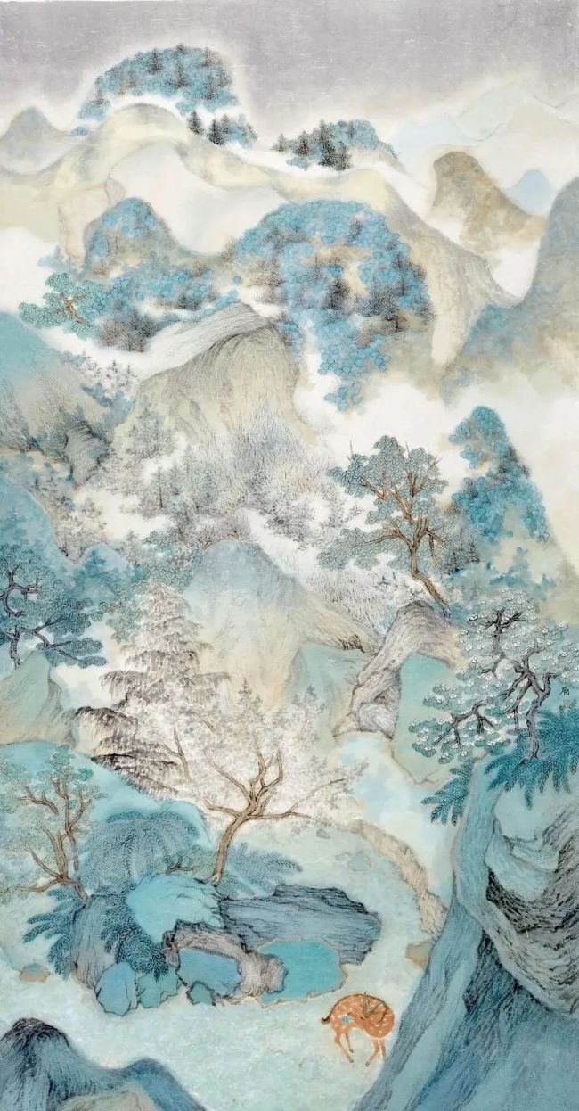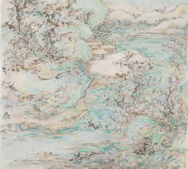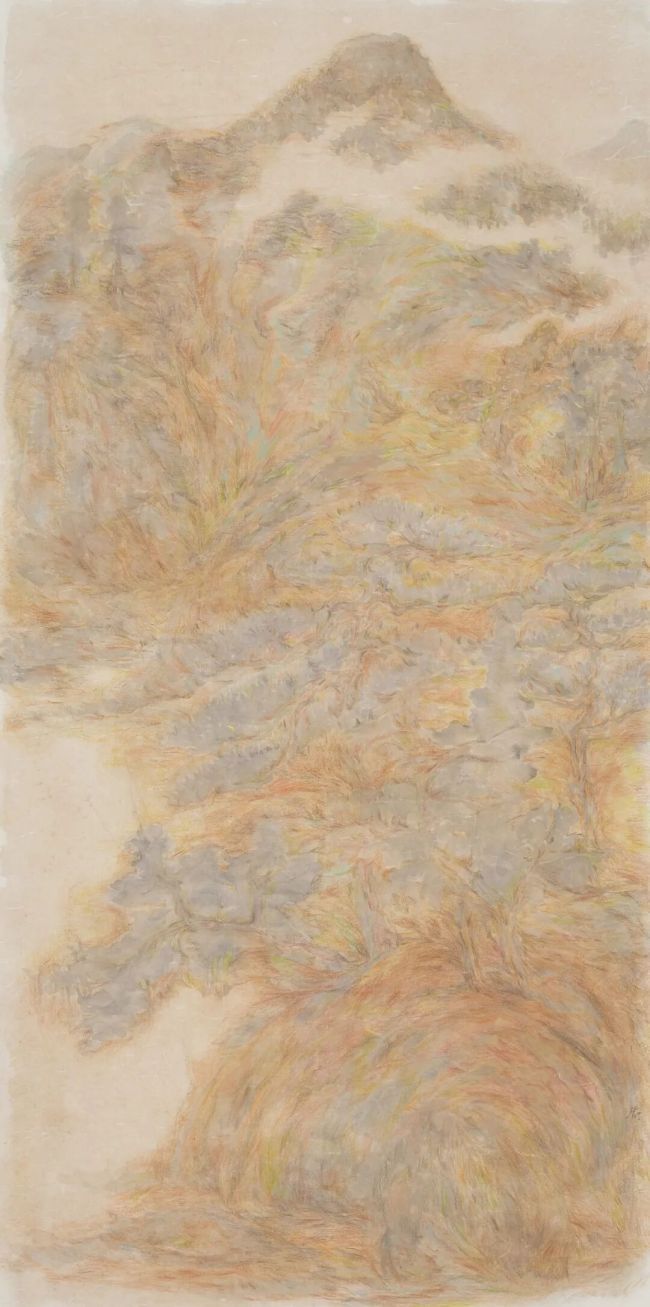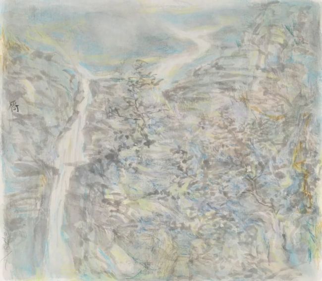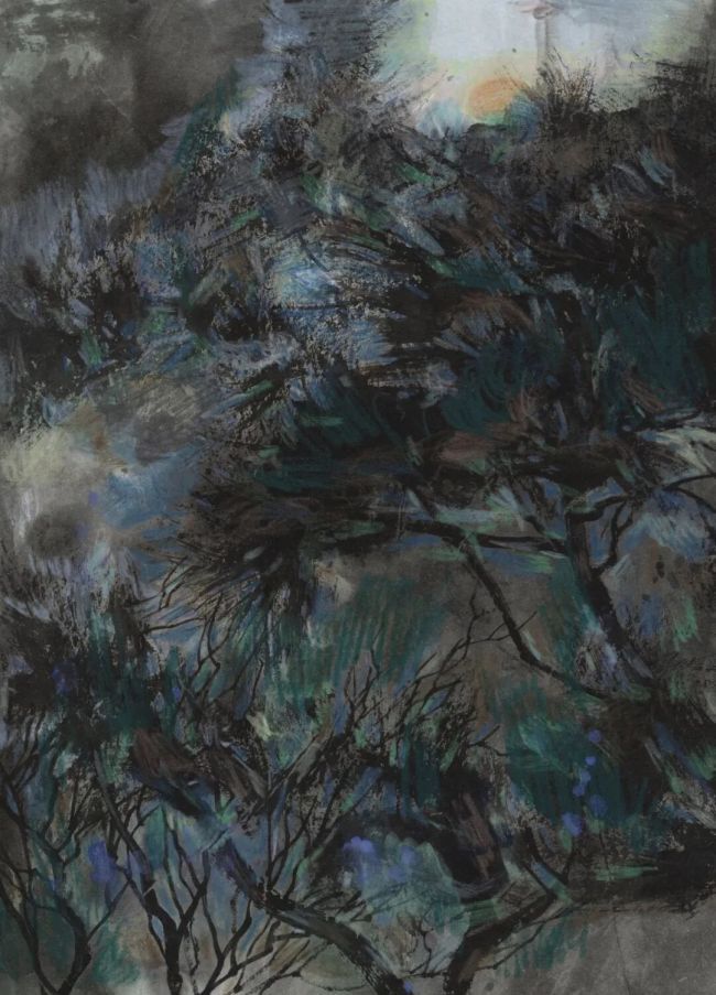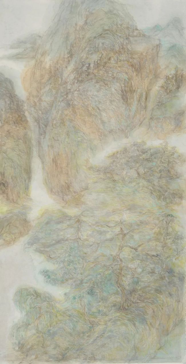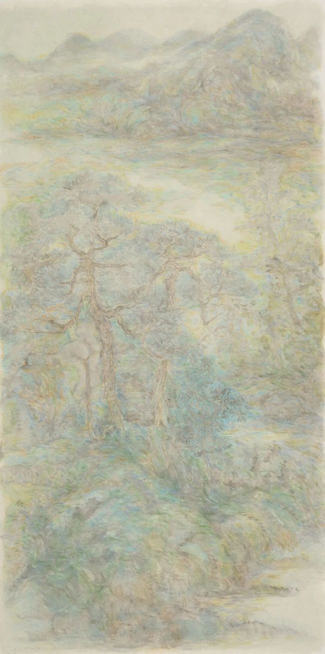 在技法层面,邵仄炯别具融通之力。他精研传统水墨的皴擦点染,将“清、沉、润、和”的雅正之气融入笔端,画中保留了南宗山水画的文人意趣,通过抽象符号打破程式化窠臼。嶙峋的山石、虬结的松树、飘渺的烟云皆形成理想化图式,自由勾勒、涂抹的痕迹如同音乐韵律,青绿设色则突破浅绛、金碧的界限,在墨与色的交响中呈现出绮丽的视觉张力。近几年大胆突破水墨边界,探求西画的材料媒介引入传统语境。丙烯、色粉、彩铅与水墨的交融,已在《侧锋》、《无尘》、《新诗吟未了》等多个展览的作品中呈现。其间画面逐渐消解了古典笔墨的执念,但仍坚持以书写性的涂绘方式关注画面光影叠加与瞬间印象的捕捉,使其更趋向表现主义的写意与抽象。