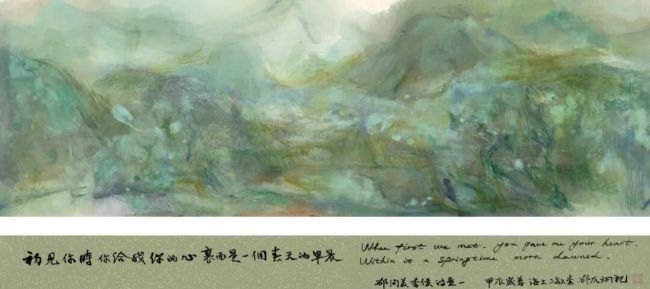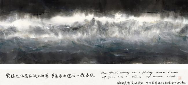 他的艺术理念始终围绕“古意与新变”展开,创作核心在于对“常理”而非“常形”的追求,早先多将经典解构为可重组的视觉元素。如“又见家山”、“天光云景”、“海上山”系列,用笔墨、程式、自然揉出自家的山水风貌。既延续了传统水墨的气象,又通过抽象化处理赋予画面现代意识。这种“脱胎换骨”的创作方式,近日在他与新诗的跨界对话展中达到新高度——徐志摩《再别康桥》的柔波幻化为水墨与丙烯交织的朦胧意象,邵洵美《季候》的抽象诗意则被转化为色、粉、墨的自由流淌,实现了“诗中有画,画中有诗”的当代诠释。