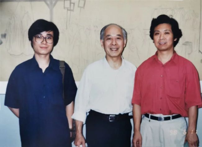 1998年王一飞于中国美术学院美术馆与顾生岳先生、唐勇力教授在毕业作品前留影