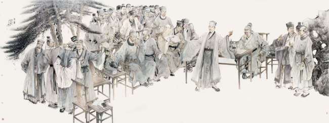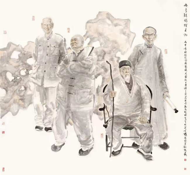 一位真正的艺术家,必然是时代的观察者与思考者。张永海的水墨人物画,始终锚定着社会现实与时代变迁的脉搏。他关注笔下人物在当代社会中的精神状态,也致力于记录一个民族的命运,承载一段历史的沉浮。在他的作品中,我们能看到知识分子与文化精英价值取向的转折、普通人在社会压力与观念更新中的精神漂泊、对传统文化与历史人物的尊崇……这些主题并非通过直白的说教呈现,而是暗藏于人物的神情、姿态与笔墨的张力之中。他以水墨为载体,将时代的褶皱与文化的力量熔铸于画面,让作品成为一面镜子——既照见个体的生命状态,也映现一个民族的精神底色。