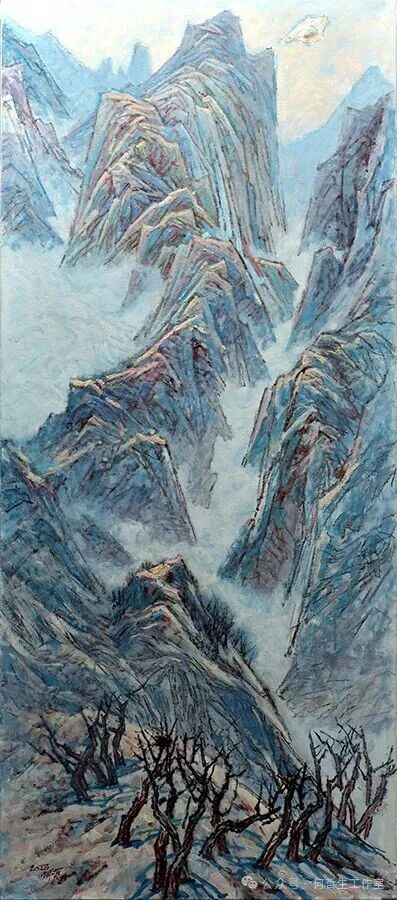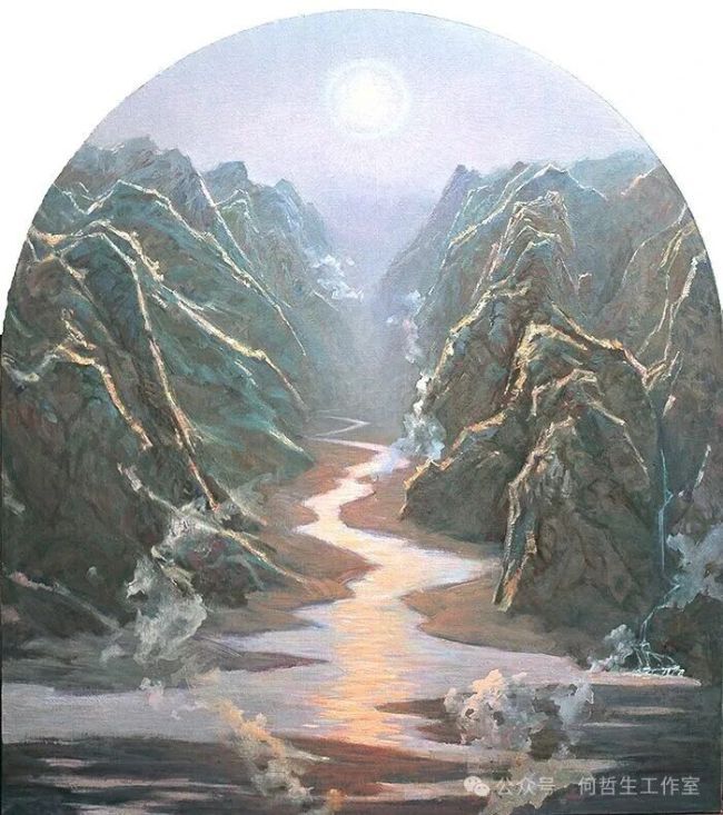 何哲生的艺术经历扎根于巴蜀文化的肥沃土壤,自幼受家乡山水熏陶,他的创作从一开始就注入了地域的深情。何哲生先生出道很早,很年轻时候就入选了高级别的艺术展览,在数十年的艺术生涯中,他以饱满的激情,创作了众多有影响力的作品。在艺术旅程中,他始终坚守对艺术的赤诚,将个人成长与时代变迁交织在画布上。他的作品在整体上呈现出一种“有机整一性”,天、地、人在其中和谐共存,这源于他对中国传统哲学中“天人合一”理念的深刻理解。在他的画作中,自然元素与人文活动彼此不是孤立的部件,而彼此交织融合,构成生命共同体。这种整体观照之眼,使他的艺术超越了简单的风景写生,升华为对宇宙秩序的沉思。