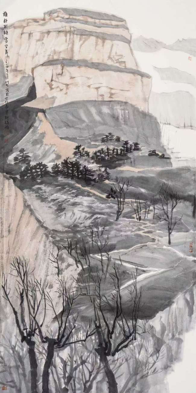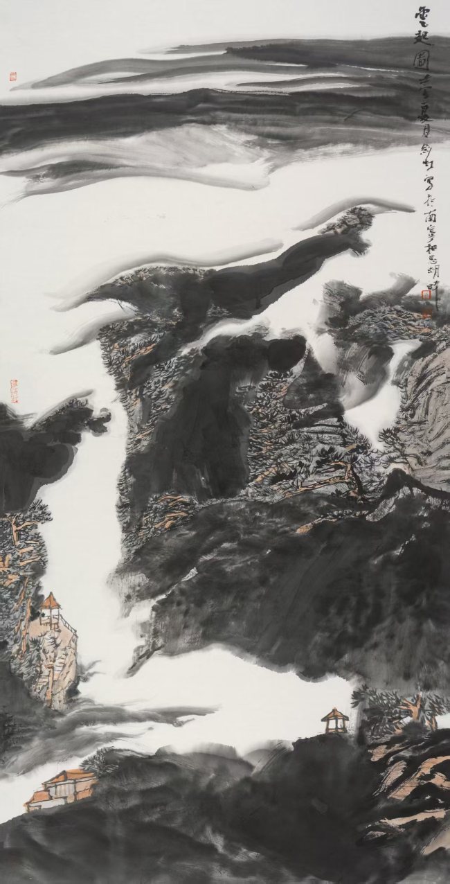 笔墨之于左剑虹,不仅是造型的手段,更是心绪的流淌与人格的外化。他的用笔,兼具骨力与韵味。远观其山势,往往以淡墨没骨写出,朦胧氤氲中尽显山川的深远与空灵;近察其岩壑、村居、林木,则常以劲健的线条勾勒,于实处见其精神之凝聚。这种虚中有实,实中有虚的辩证运用,使画面在“清空”与“质实”之间取得了微妙的平衡。“清空”者,意境高远,雅致峭拔;“质实”者,结构严谨,形物深曲。二者相得益彰,共同构筑了一个既可供精神栖居、又可任神思驰骋的审美空间。