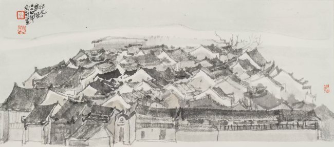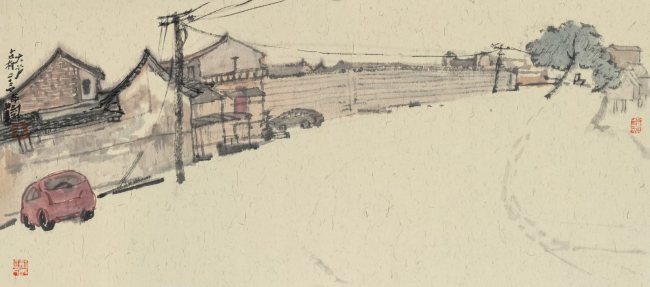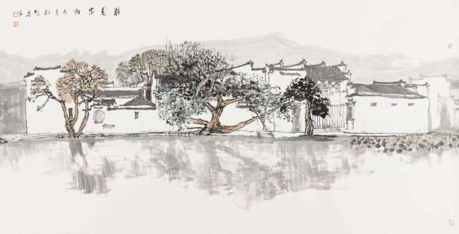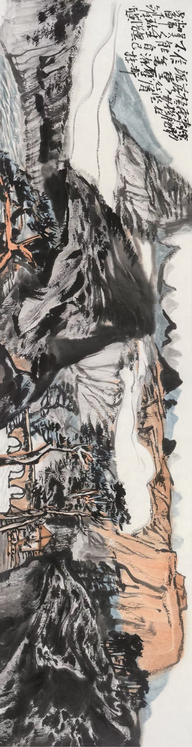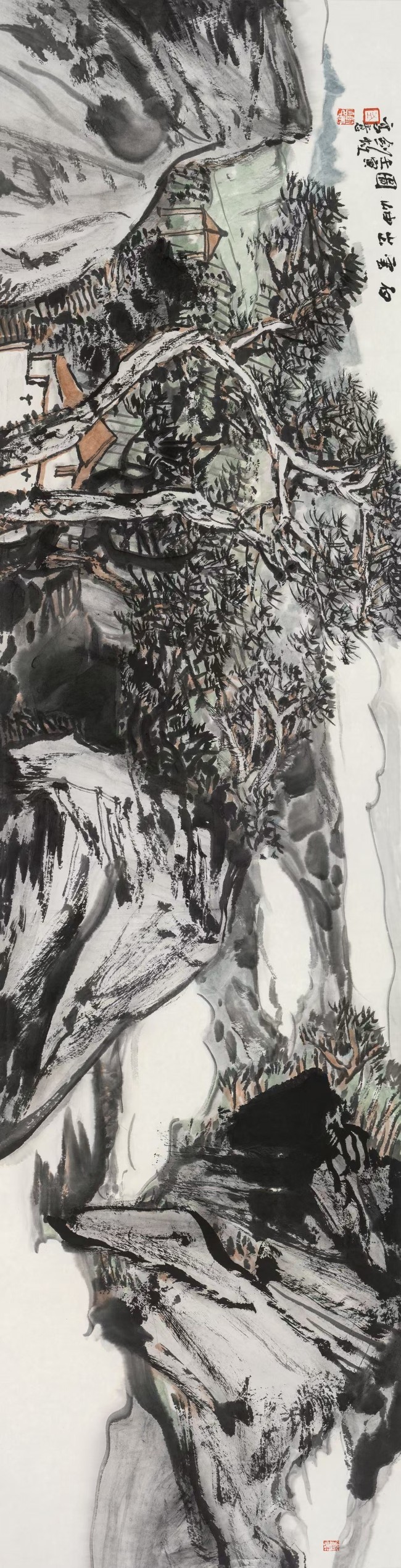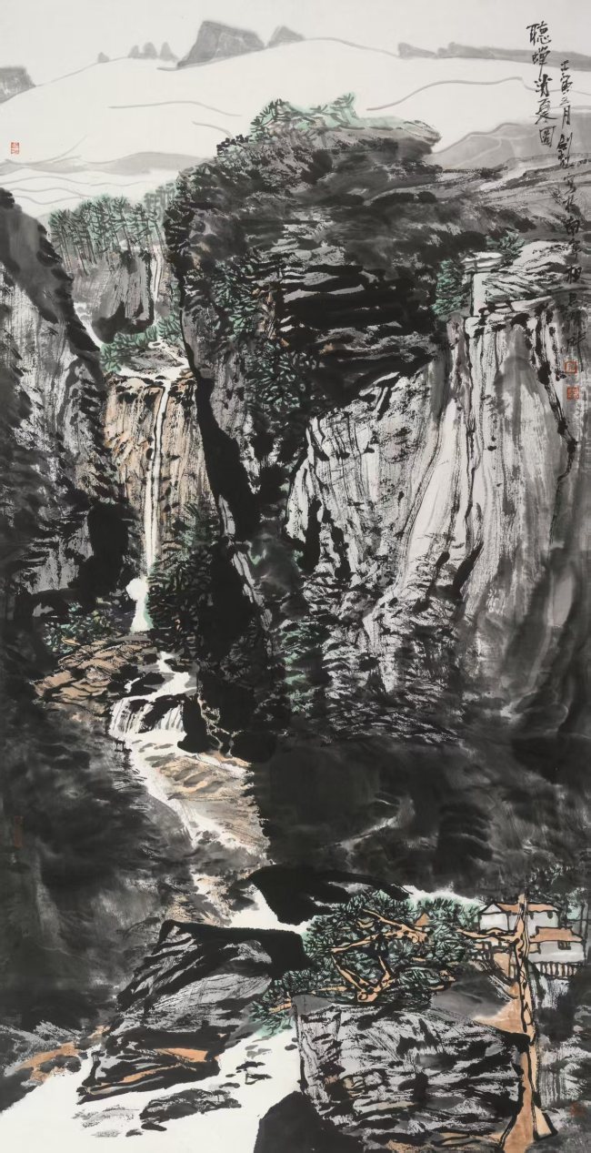 笔墨之于左剑虹,不仅是造型的手段,更是心绪的流淌与人格的外化。他的用笔,兼具骨力与韵味。远观其山势,往往以淡墨没骨写出,朦胧氤氲中尽显山川的深远与空灵;近察其岩壑、村居、林木,则常以劲健的线条勾勒,于实处见其精神之凝聚。这种虚中有实,实中有虚的辩证运用,使画面在“清空”与“质实”之间取得了微妙的平衡。“清空”者,意境高远,雅致峭拔;“质实”者,结构严谨,形物深曲。二者相得益彰,共同构筑了一个既可供精神栖居、又可任神思驰骋的审美空间。