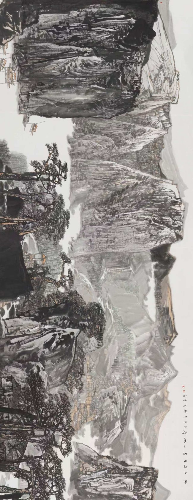左剑虹的山水艺术,宛如一泓深潭,映照出天地造化的万千气象。观者步入其营造的山水世界,恍若置身于一个既真实又超验的境地——这里既有漓江风物的清俊奇峭,又有画家胸中丘壑的雄浑苍茫。他以一种内省而真诚的姿态,回归到艺术创作最为本真的源头——“心”与“物”的交融互渗。他的山水艺术创作实践,并非对自然表象的简单摹写,亦非对既定程式的机械重复,而是一场持续进行的、以笔墨为媒介的精神行旅,是画家内在生命与广袤自然在刹那间的诗意共振。