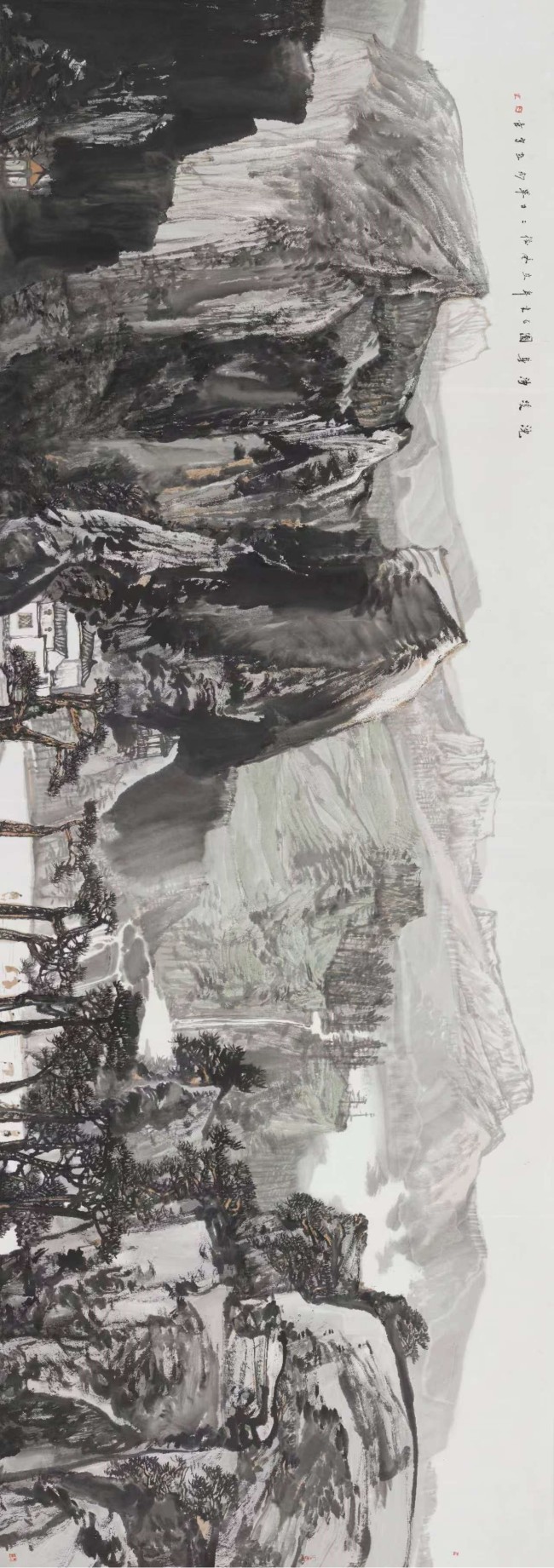 在画面的空间架构上,左剑虹深得传统“三远法”之精髓,并能出以新意。他尤其擅长运用几何化的山体构成、对比与错迭,营造出拔地而起、蜿蜒升腾的动势,赋予了静态山水以内在的张力与运动感。这种处理方式,强化了山水的雄浑气势与奇俏风骨,同时也揭示了自然造物内在的秩序与无限丰富性。而其间留白的巧妙经营,更是匠心独运,使“无画处皆成妙境”。这些留白,时而成流云,时而成水汽,时而成广阔的天空,它们不仅是画面气息流转的通道,更是引发观者无限遐想的空间,使得整个画面在深远高旷之中,洋溢着一种静谧、祥和而又生机盎然的氛围。