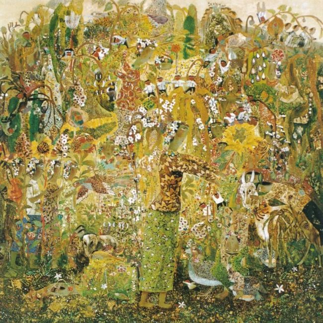 没有空间,没有时间,没有属性,没有性别,层层叠叠的形象,充塞着童话般的梦,人与禽也可喃喃细语,梦幻般的乐土溶于特殊的画面形式之中,这便是崔进的世界。