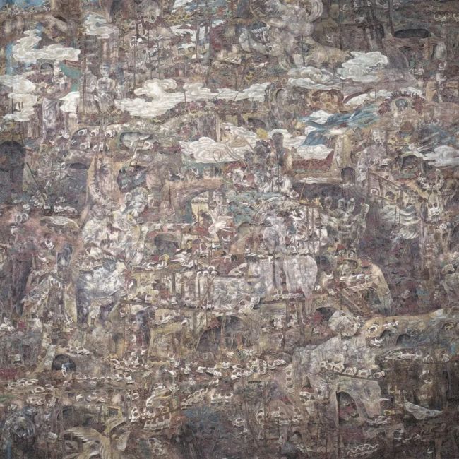 他极力寻找自己的语言,选择“小人点”作为精神意向的载体,散布于画面的每一方寸,构图充盈,色彩跳跃。它说不上某宗某派,却以视觉上的强烈刺激把人带入与作者同样的迷狂状态……