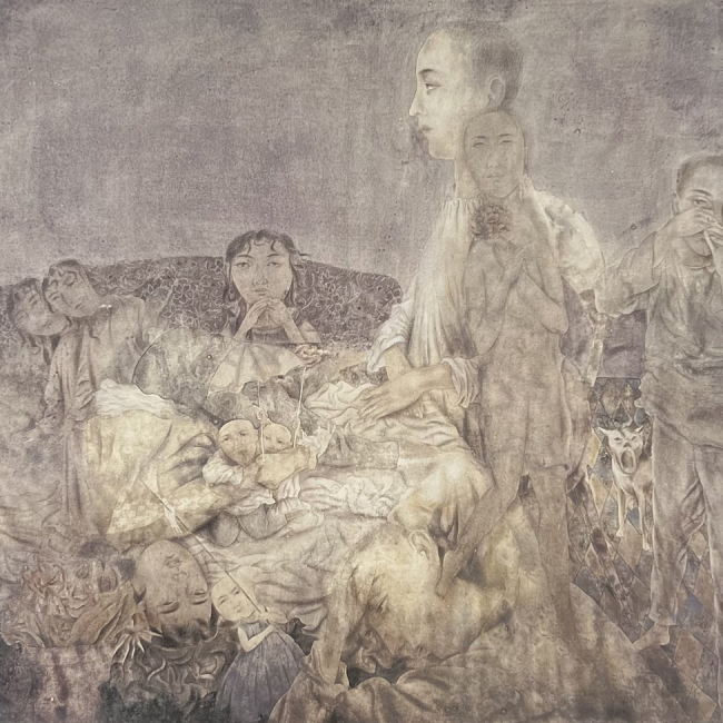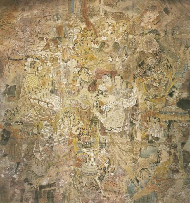 在《欢乐今宵》中遨游天际的祥云瑞鸟、奇花珍禽与优雅静穆的少女、缓步行进的仪仗队伍、纵横驰骋的戏剧人物共同营造着一种富于历史底蕴和东方格调的“欢乐”。由于在人物形象、色调敷染和空间节奏处理上直接吸收了六朝《洛神赋图卷》和佛教经变图的象征手法和图式,更增加了画面神话般的叙事特征,它反映了人的欢乐本性在一种历史和美学沉思中所获得的那种超越性自由,在历史隐喻中寻找到与我们生存现实相关的视觉意义。