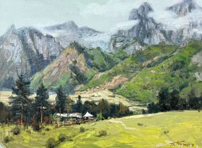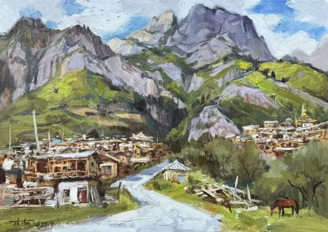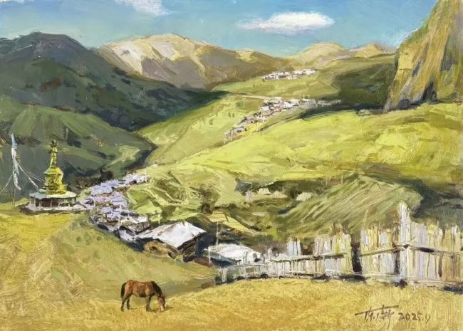 近五年,扎尕那游客激增,民宿如雨后春笋般涌现,热闹之余,商业气息也愈发浓厚。所幸,大片草原与巍峨群山依旧,景色依旧壮美动人。后续几日,我们携带画具穿行于山川小路,探寻扎尕那的极致美景,创作了几幅极具当地特色的风景写生。