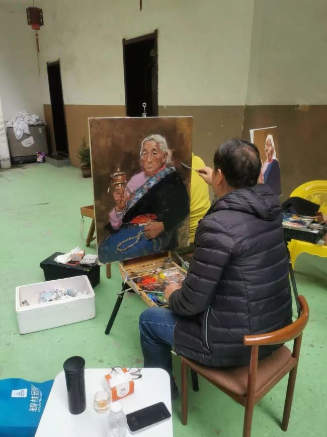 一日天降大雨,无法外出写生,我们便邀请芯草当模特,她欣然应允。旺秀取出她结婚时的盛装——一套绣满藏族特色图案的厚重羊皮藏袍,足有二十多斤重,穿上后连走路都略显艰难。芯草的母亲又拿出诸多珠宝首饰,帮女儿精心装扮。平日里身着汉族便装的芯草,换上藏族盛装后惊艳全场,那美丽大气又略带阳刚的藏族新娘形象,深深震撼了每一位画家。大家兴奋不已,即刻拿起画笔,迅速投入写生状态。