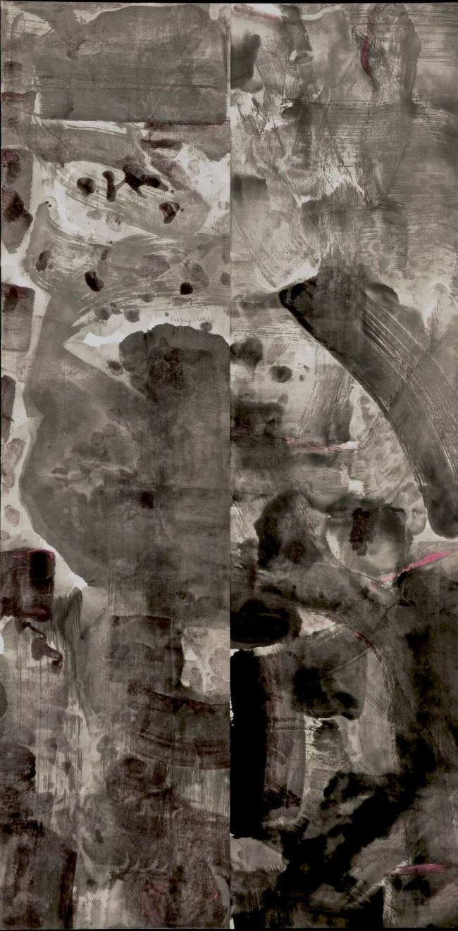 多年的设计教学形成了对“构成”与“重组”的敏感,抑或美术史研究中对跨文化审美的思考,我开始有意无意地尝试让“意象”与“抽象”在创作中对话。我的创作习惯从水墨的“偶然生成”开始:常常将几张同规格宣纸平铺叠放于地,任水墨与颜料自由泼洒、书写,墨色的渗化、色彩的碰撞、痕迹的重叠,都是自然而然地生成。