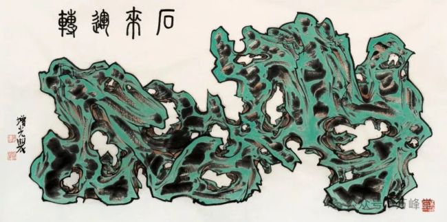 岳增光深耕中国画坛数十载,以青绿山水立家,笔墨间始终浸润着对传统的敬畏与对自然的热爱。他的青绿山水设色清丽而不妖冶,线条劲健而含温润,将山川丘壑的雄奇与灵秀熔于一炉,形成了独具辨识度的艺术风格。而这份对山水的深情,恰为他与赏石的结缘埋下了伏笔——山水是大地的骨骼,奇石是自然的精魂,二者在审美内核上一脉相承,皆以“天人合一”为至高追求。