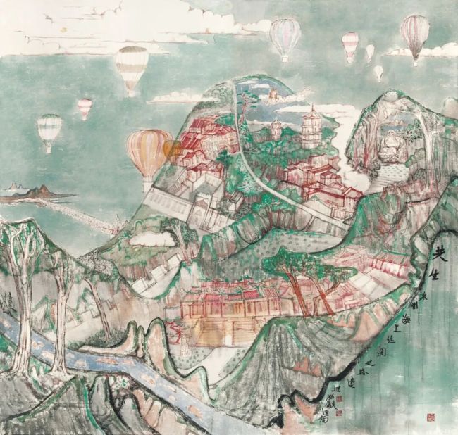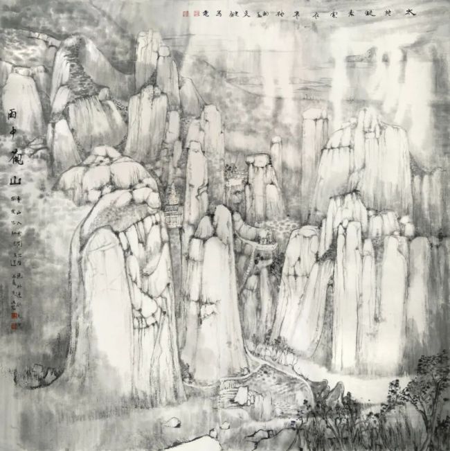 在建福的绘画中,我们可以清楚的感受到他对传统绘画“时间性”的表达方式的继承与使用。北宋画家向往的“可行、可望、可居、可游”的画面构成方式在他的画面里自然流露,他的每张作品都给观众呈现了一个可被“游历”的世界:山川递远、烟岚变幻,观者的视线宛若沿着山径徐徐而行,时间因而被体验为一种持续的过程,而这些凝固的瞬间则体现出亘古不变的永恒感。这是一种熟悉的感受,恰似我们在范宽的《溪山行旅图》中看到过巨大山崖下逶迤穿行的商旅,在郭熙《早春图》中感受的春日山谷中的云蒸霞蔚,在李唐《万壑松风图》中体验的千百年风霜积淀下嶙峋岩石与盘曲古松的脉动。在建福的画面中,不同时刻和类型的景象被整合于同一画幅内,如同他的《行走的风景》系列作品,风从深壑里吹出,掠过树梢,拂过栏杆与台阶,仿佛从传统经典中传来,又穿越至现在的某个清晨。房子、树木与时间一起被压缩进空间,形成一种非线性、循环性的视觉时间结构。