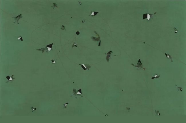 但艺术的出新不仅仅是在题材或者主题上的不同,更深层的动力源于艺术理念和知识观的更新以及体会艺术思维的智性之美。星空天文系列中自然灵动的飞鸟蕴含着上古鸟神的天地宇宙之思,也象征着平凡自然的生命之灵,融入星空无限之中的飞翔以此对个体感知的时间、生命和现实存在等问题有所思考和触动。