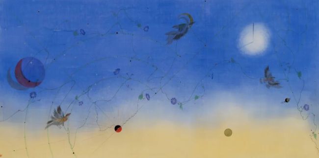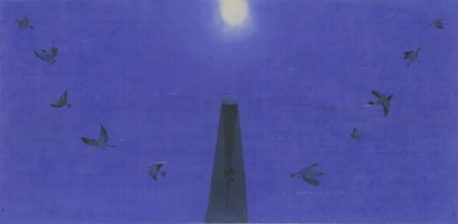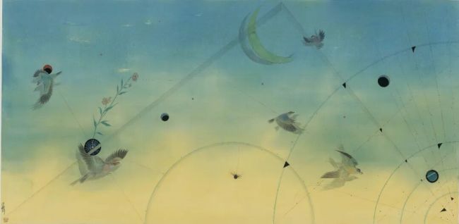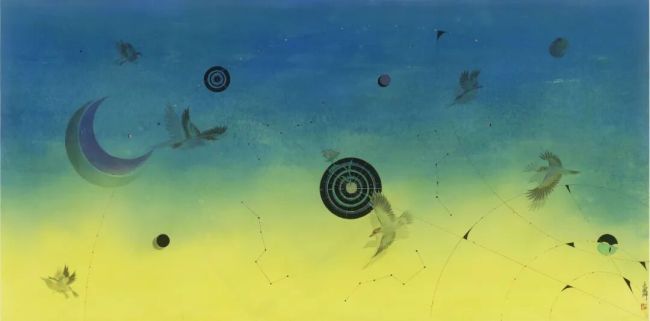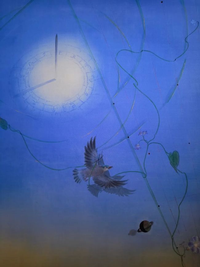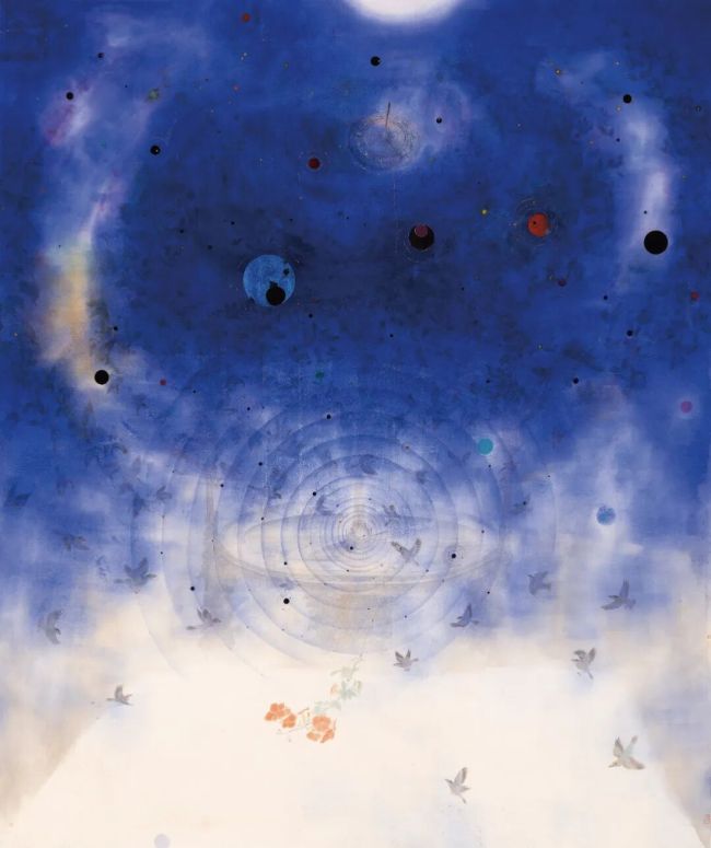 但艺术的出新不仅仅是在题材或者主题上的不同,更深层的动力源于艺术理念和知识观的更新以及体会艺术思维的智性之美。星空天文系列中自然灵动的飞鸟蕴含着上古鸟神的天地宇宙之思,也象征着平凡自然的生命之灵,融入星空无限之中的飞翔以此对个体感知的时间、生命和现实存在等问题有所思考和触动。