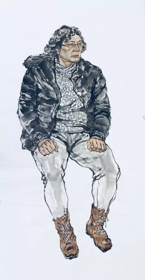 我画人物几十年,对国内省内称得上人物画家的也算是了如指掌,没听谁说过同君画人物。我给大三人物班上课问起之前谁讲人物课,同学们说王同君老师。画花鸟的教人物画我没放在心上。我和同君也是少联系,一日开会见面寒暄,坐在一起。他打开手机相册,指着水墨人物写生图片对我说“提点意见”。坦白地讲,我真的很惊诧,同君的水墨人物,绝对人物画的专业水平,我画亦不过如此。同君的人物造型,笔墨线条,游刃有余,驾轻就熟,非一日之功,岂是出自花鸟画家之手?山水画追求“气韵”,花鸟画追求“情韵”,人物画追求“神韵”。“神韵”固然是眉目传情,顾恺之说“尽在阿睹中”,手和脚的肢体语言也是“神韵”的组成部分。同君刻画人物形象精准生动,繁简入微,张弛有度,手和脚处理得当洗练,模特年龄、身份、性别拿捏的尺度沉稳果决。这已是人物画家必备的功力和技巧,同君却不露声色的易如反掌,如何有此秘籍?
