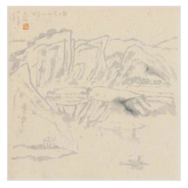 远山如黛,近水微澜,山水与岩石是画面的主要元素。岩石嶙峋间的空灵之美,给人一种澄怀观道、境由心生的观感;山石间的细节刻画不求形似、在乎神似,不仅体现自然的雄伟与壮丽,更蕴含了自然的内敛与沉静。水流的恬淡与永恒,颇具动感,表达着一种柔美与坚韧。笔墨虚实动静中,计白当黑,呈现一派静谧与深邃的古雅质朴之风,自由与独立的灵动自然之韵。
