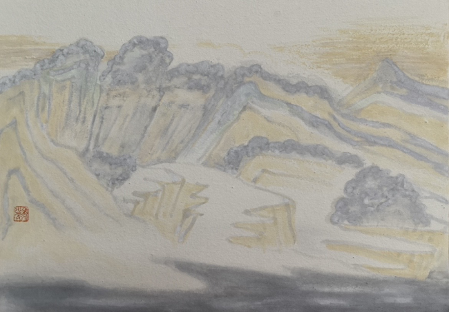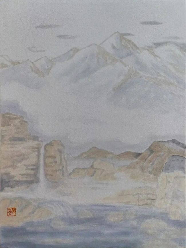 “我的创作灵感来自于禅意的感悟。敦煌壁画所传递的宁静与淡然,与禅意所追求的内在淡泊和智慧有着异曲同工之妙。每一笔的描绘,都是对心灵境界的探索与表达,是一次与自然、与自我的对话。在这些作品中,山水、楼阁、树木和岩石不仅仅是自然景象的呈现,更是心境的象征。