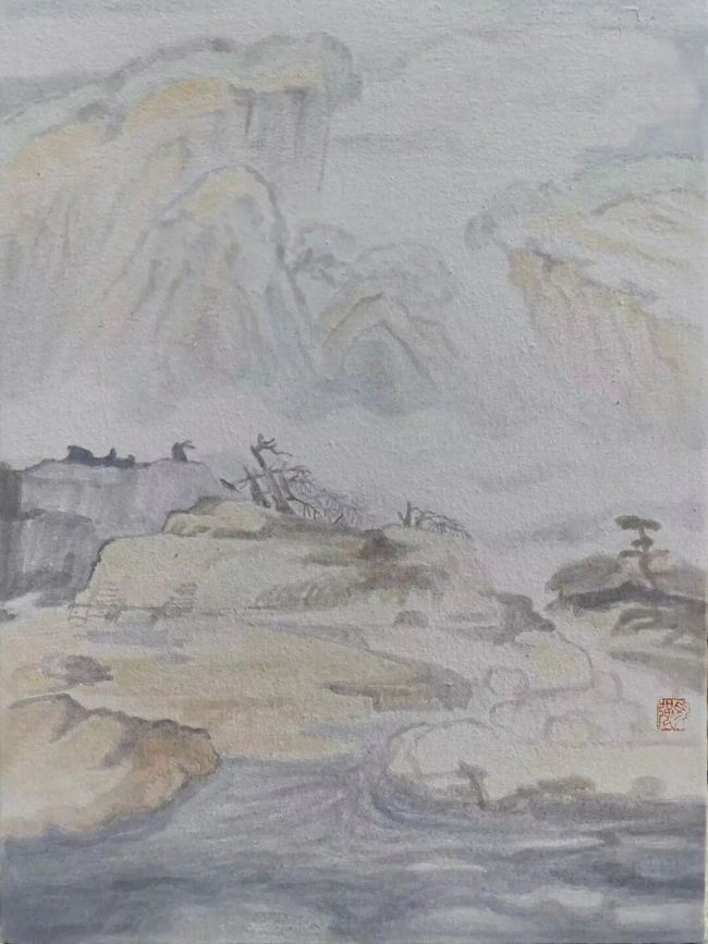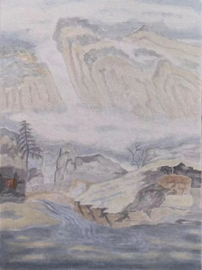 远山如黛,近水微澜,山水与岩石是画面的主要元素。岩石嶙峋间的空灵之美,给人一种澄怀观道、境由心生的观感;山石间的细节刻画不求形似、在乎神似,不仅体现自然的雄伟与壮丽,更蕴含了自然的内敛与沉静。水流的恬淡与永恒,颇具动感,表达着一种柔美与坚韧。笔墨虚实动静中,计白当黑,呈现一派静谧与深邃的古雅质朴之风,自由与独立的灵动自然之韵。