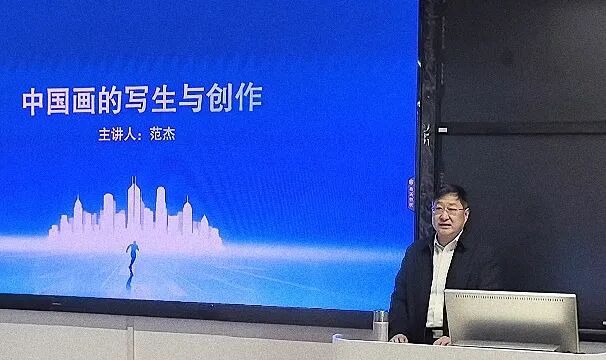 仪式前,范杰在格物楼以《中国画的写生与创作》为题,为全体学员带来一场精彩的学术分享,学校党委书记满军主持开讲仪式。学校办公室、美术系、图书馆相关负责同志及师生代表、中国艺术研究院范杰导师班学员等180余人参加活动。