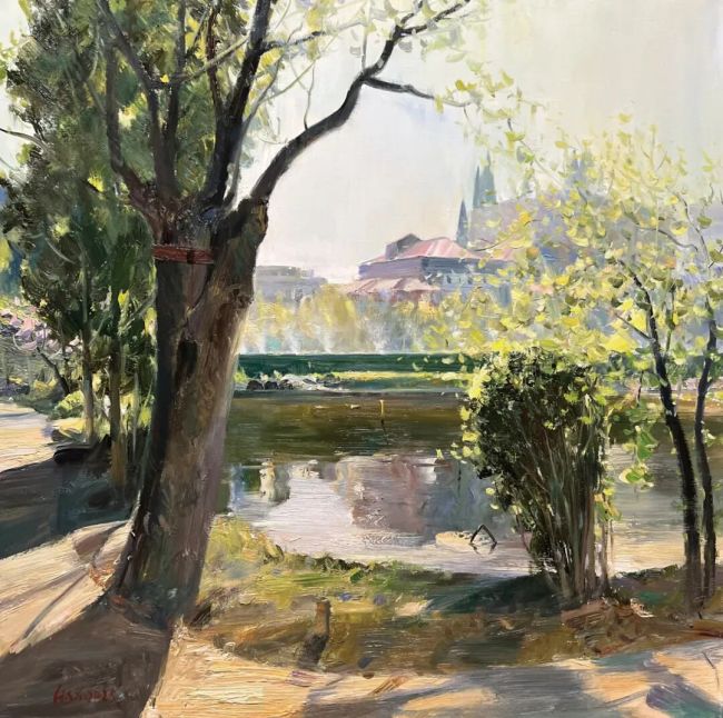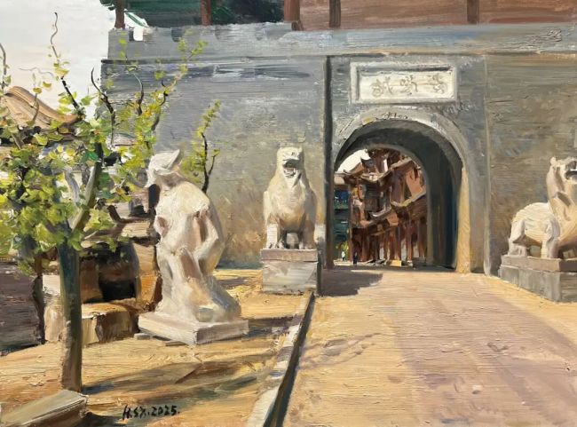 黄胜贤的油画在艺术手法上尽显匠心,将传统油画的技艺精髓与个人创作理念深度融合。他对笔触的驾驭极具表现力,时而以细腻短笔触刻画物象的细腻肌理,通过层层叠加构建出丰富的画面层次;时而以洒脱的长笔触勾勒轮廓、传递情绪,让线条在虚实之间勾勒出灵动气韵。光影处理是其鲜明特色,他精准捕捉自然与场景中的光线变化,以明暗对比的微妙把控塑造空间纵深感,使画面摆脱平面化的局限,呈现出立体而通透的质感。