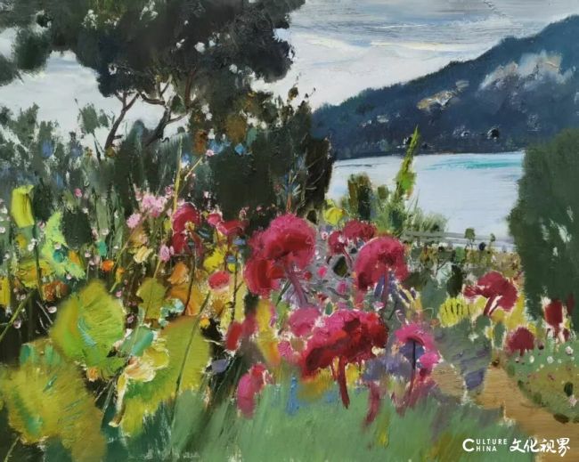 其油画语言是一场精妙的“笔彩交响”,于西方印象派、后印象派光色技法的研习中,熔铸中国传统“写意”精神,形成极具个人辨识度的视觉语法。色彩运用上,他突破客观束缚,以主观色调营造氛围、传递情绪。那些湖畔的繁花、海岸的礁石、山间的林木,在他的调色盘里被赋予了超越现实的绚烂与明快,补色的碰撞、色调的调和,既有着西方现代绘画的色彩张力,又暗含中国传统绘画的装饰意趣与意境营造。笔触的运用更是其艺术语言的核心,或厚涂堆叠,或薄擦轻扫,或奔放如草书狂舞,或细腻如工笔丝描。他以富有节奏的笔触,塑造出物象的质感与体积,更传递出画面的情绪与韵律,在油画材质的特性中,融入了中国书画“笔墨精神”的写意性,让每一处笔触都成为情感的痕迹、精神的外化。