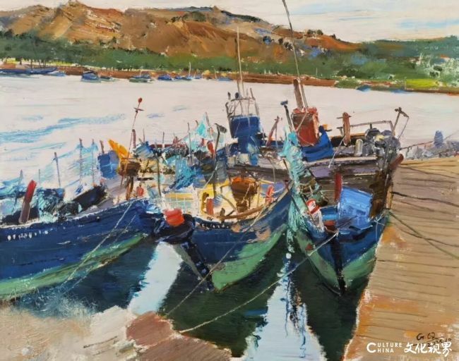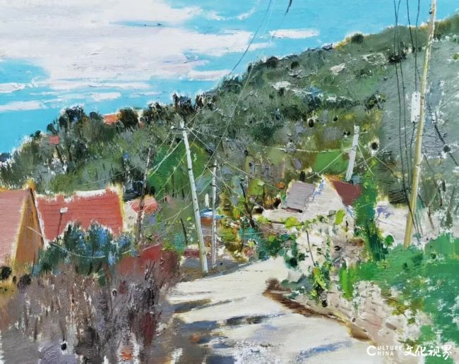 史国强的风景创作深植于“写生”传统,却绝非对自然物象的被动摹写。从海滨渔港到山野村落,从湖畔花境到山间小径,他的足迹所至皆化为情感投射的载体。那些渔港的舟楫、山村的屋舍、湖畔的繁花,在他的笔下并非单纯的景物复刻,而是经心灵过滤后的意象重构。他以写生为契机,捕捉自然瞬间的光影与气息,又以主观化的艺术处理,将眼前景致升华为饱含个人情思的视觉诗行。胶东乡村的红瓦绿树、海滨码头的蓝调水波、山野小径的斑驳光影,在他的画布上都成为了心灵的镜像,是“外师造化,中得心源”创作理念的当代诠释。画面中线条的经营、色块的搭配,既呼应着自然的形态,又暗含着中国传统绘画“经营位置”的章法智慧,在写实的基底上,完成了向心象世界的跨越。