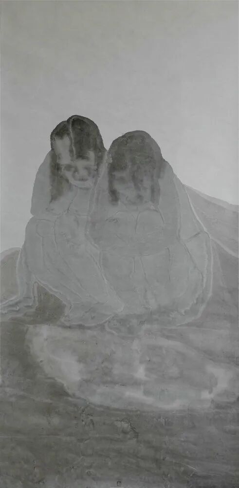 李连志的绘画具有明显的当代风格和思辨气质。从语言上来说,李连志发展了传统笔墨中深厚绵密一路,在他的画中,墨色厚重得几乎凝结在一起,粗重的线条与大块沉重的墨色相互叠压,难以分辨,由此淬炼出的语言,犹如金属般的坚硬,李连志以此刻意强化、加重了画面的沧桑感。确实,李连志笔下的人物形象是苦涩与厚重的,《天堂》系列中静谧的天空、流转的白云、屹立的高山、坚实的土地以及站立在天地之间的人们,无不在向观者传达一种坚韧的性格和顽强的生命意识。应该说,李连志是以悲天悯人的精神,以仰视的角度去体味高原人的生命状态和情感世界的。在最近刚刚完成的毕业创作《土地》中,李连志将这种观念发挥到了极致,在这幅尺寸巨大的画作上,李连志描绘了近百个农民形象,这些本来极为普通的人物在画家的笔下,变得高大伟岸,带着坚韧和乐观的情绪,他们伫立在山前、树下,静静地看着画外,仿佛群山屹立,虽沉默不语,却震撼人心。画家将那些层层积染的墨色和厚重坚韧的线条,转换为一个充满庄严色彩的世界,仿佛只有在这个世界里,李连志才能听到来自精神世界的回响。