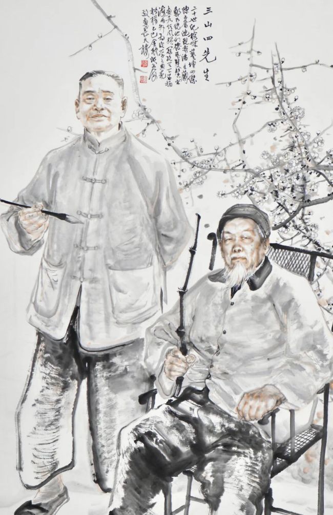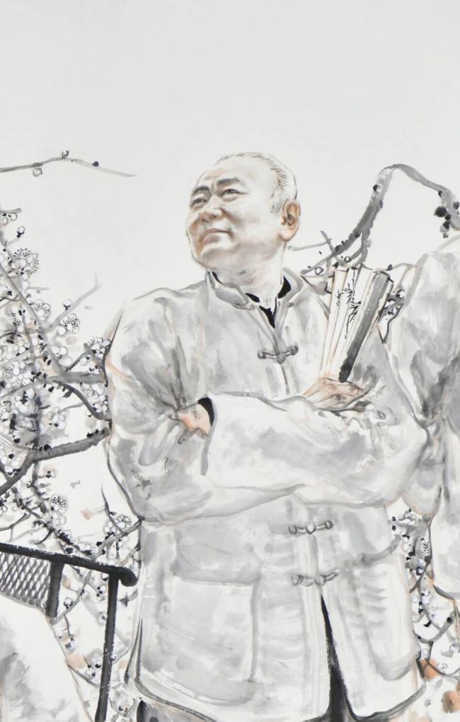 背景中的梅花元素,同样是张永海绘画笔法的匠心体现。在尝试过榕树、松石、竹子等多种元素后,他最终选择了白梅。“梅花香自苦寒来”,梅花象征着四位先生坎坷的艺术生涯与不屈的精神品格。清雅的梅枝还将四位独立的个体有机串联成一个整体,寓意着他们将艺术的芬芳永远留存于人间,启迪后世。